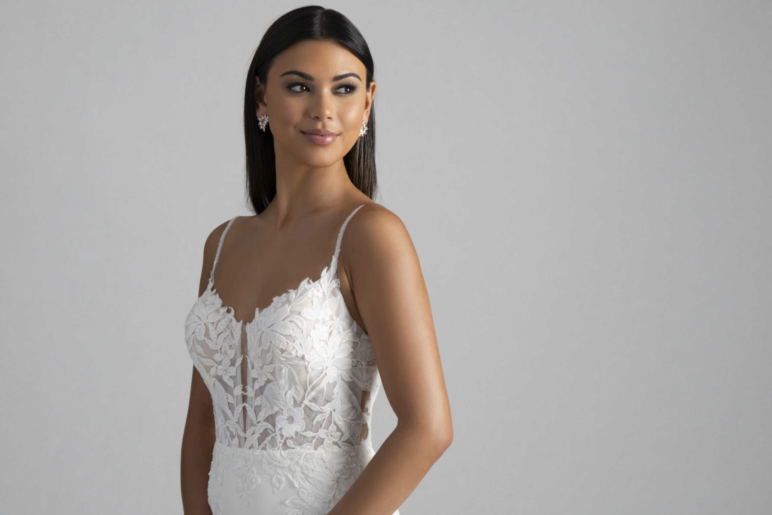 Float into forever with the Madison James MJ1115 – Fiori, a wedding gown that whispers romance with every step. Designed in a sleek sheath silhouette, this sleeveless masterpiece features a dreamy illusion bodice adorned in floral lace that seems to blossom across your skin. The plunging neckline is both elegant and daring, while delicate spaghetti straps and a sculpted low back add modern charm. Flowing into a soft crepe skirt, the chapel-length train blooms with illusion lace petals — a vision destined to trail behind you like a love story.