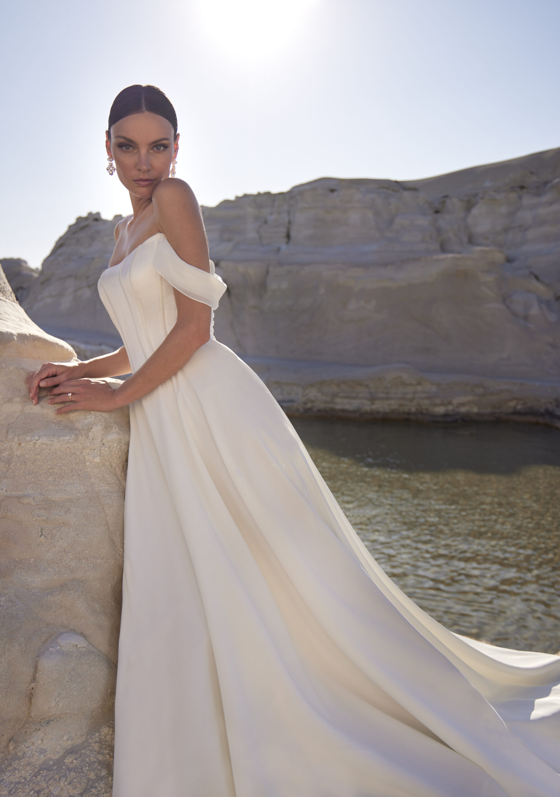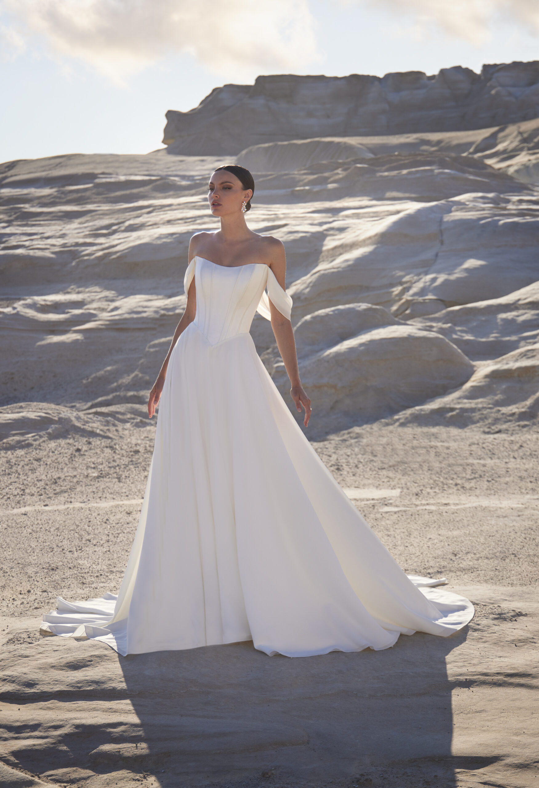 Step into timeless sophistication with the Madison James MJ1204NC gown — a flawless fusion of romantic elegance and modern grace. Featuring a structured satin bodice with a sculpting cat eye neckline and delicate off-the-shoulder chiffon sleeves, this A-line silhouette flatters every movement with its airy chiffon skirt and flowing chapel train. The Basque waist and visible boning enhance your curves while adding a couture touch. Ideal for the bride drawn to quiet luxury, this dress whispers elegance with every step — effortless, poised, unforgettable.