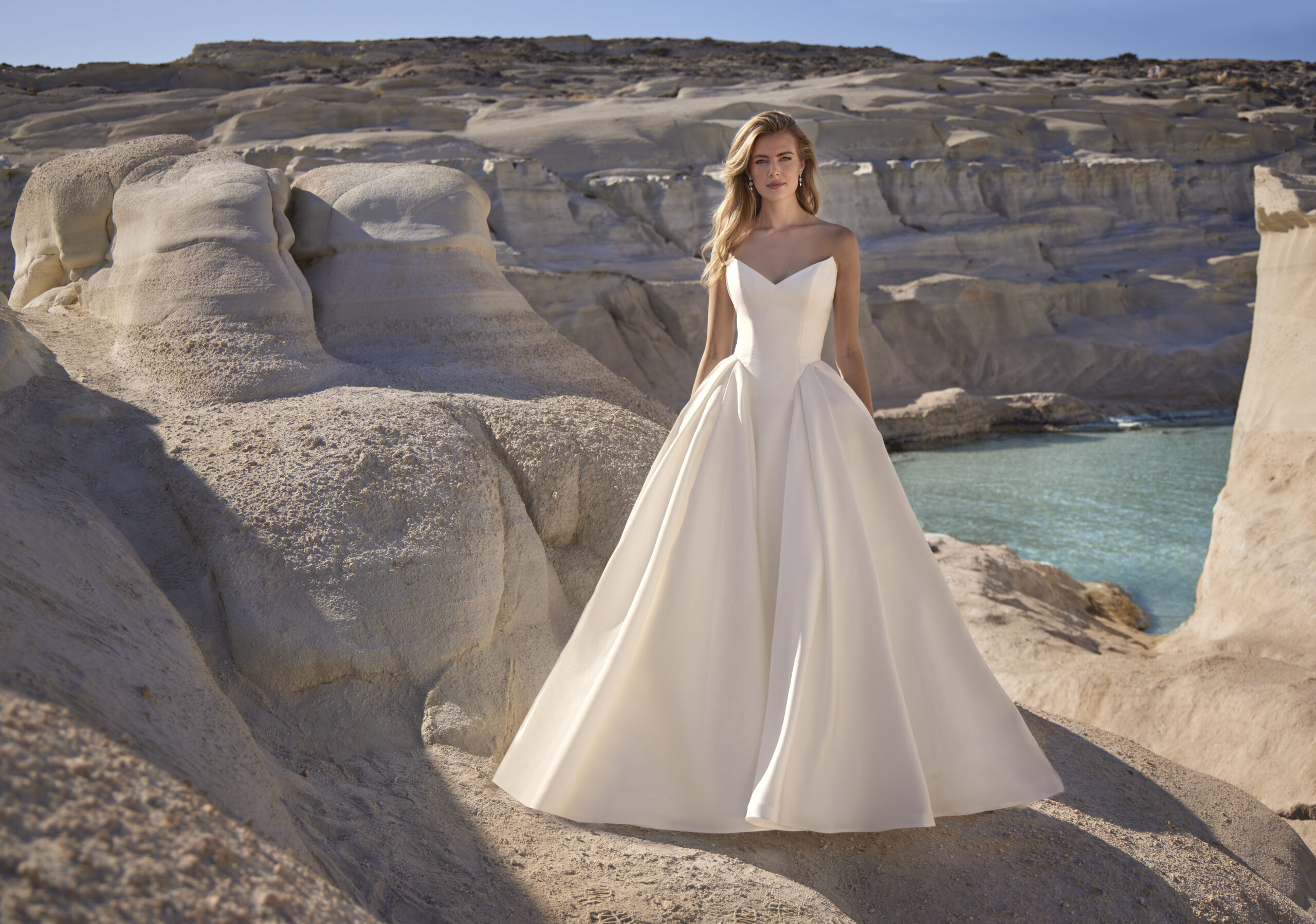 Make a grand entrance in the Madison James MJ1208 gown – where timeless romance meets bold modernity. Designed in luxurious Mikado, this striking ballgown features a unique cat-eye neckline and a dramatic basque waist that flatters the figure and elevates the silhouette. With its clean, sculptural lines and voluminous skirt, you’ll exude elegance and confidence from every angle. The button-down back adds a delicate touch of tradition, making this gown perfect for the bride who desires modern sophistication with a regal twist. Walk down the aisle feeling like royalty – poised, powerful, and unforgettable.