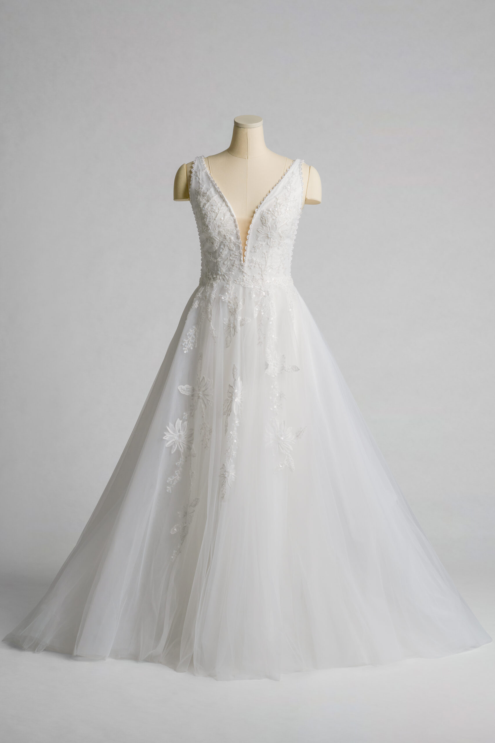 Gracefully romantic and effortlessly elegant, X172L – Sommer is a gown that captures the magic of a fairytale moment. Crafted from layers of airy tulle and adorned with delicate floral appliqués and soft beading, this A-line silhouette flatters every figure with its natural waist and flowing chapel train. The plunging V-neckline and deep illusion back create a perfect balance of femininity and modern allure. As you walk down the aisle, each petal-like detail whispers beauty, softness, and quiet confidence — because this is your moment to bloom.